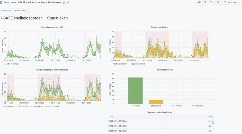 De dashboardweergaven die binnen het platform beschikbaar zijn, bieden een snelle analyse in de vorm van grafieken voor geselecteerde tijdsperioden. De verkeersrapporten hebben betrekking op snelheid, volume en richting. Grafieken voor de fietssensoren en radarsnelheidsborden bevatten tellingen per snelheidscategorie, terwijl het TMS-SA-classificatiedisplay ook grafieken per lengteklasse bevat.